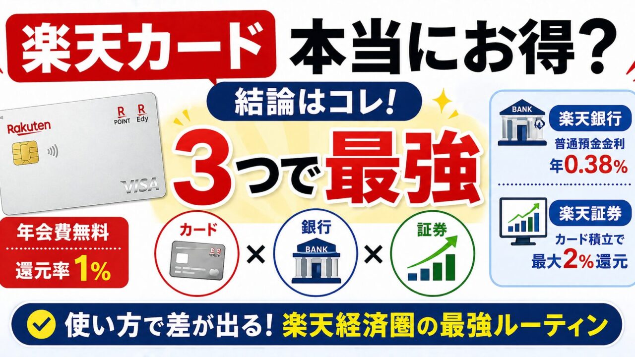 楽天カードはカード単体でも年会費無料・還元率1%と優秀ですが、楽天銀行・楽天証券と3つセットで使うとシナジーが生まれます。